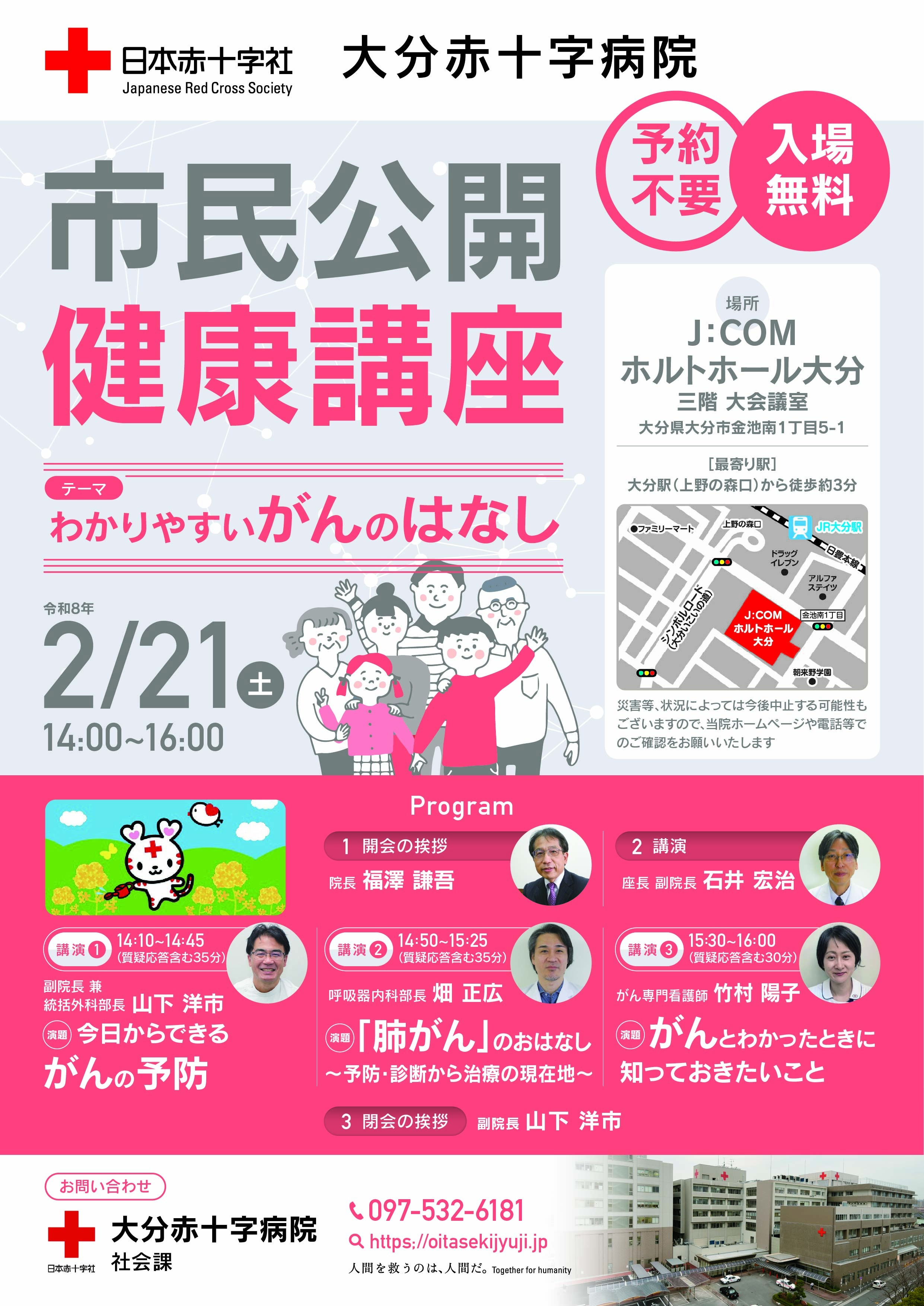 令和7年2月21日(土)14:00~16:00 J:COMホルトホール大分にて市民公開健康講座を開催いたします。