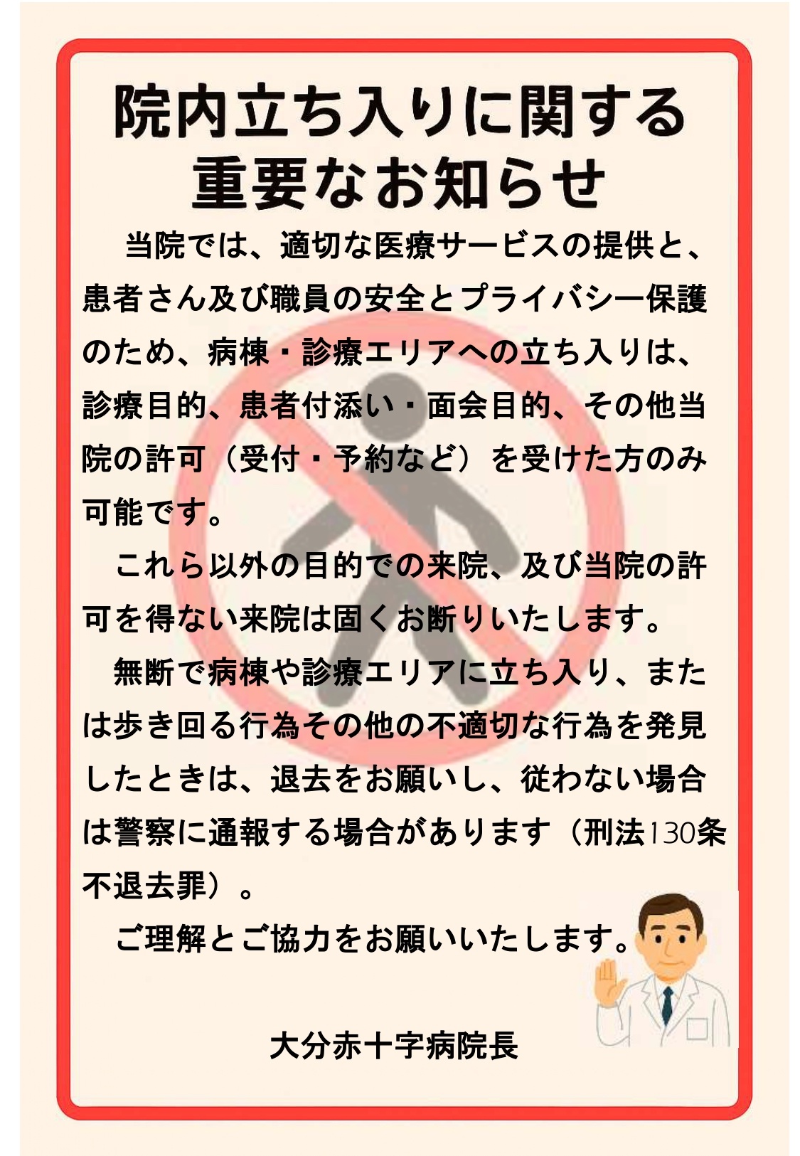 - 正当な理由もなく院内に立ち入ること、長時間居座ること、又は退去を求められても応じないこと