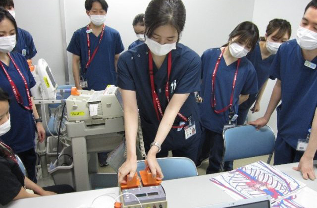 臨床工学技士とともに、人工呼吸器関連機器の取り扱いを学ぶ